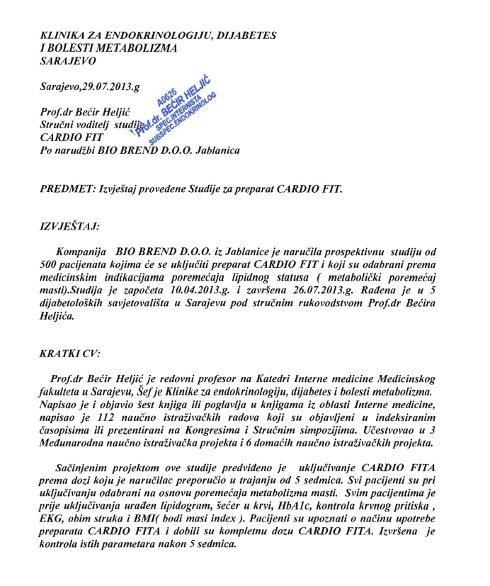 Pozitivno delovanje Cardiofita je potvrđeno kliničkom studijom koja je sprovedena od 10.04.2013. do 26.07.2013. godine na Klinici za endokrinologiju, dijabetes i bolesti metabolizma UKC-a Sarajevo. (Journal of Health Sciences, volume 4, Number 3, December 2014 – The role of natural supplement of apple vinegar and syrup in the management of type 2 diabetes mellitus)